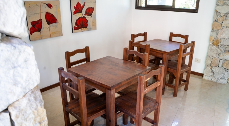 1 habitación matrimonial, 1 habitación con 2 camas single, living-comedor c/TV led, sofá cama p/2 personas, cocina completa, baño auxiliar c/ducha, baño principal, deck c/ parrilla individual y juego de jardín, caja de seguridad y alarma.